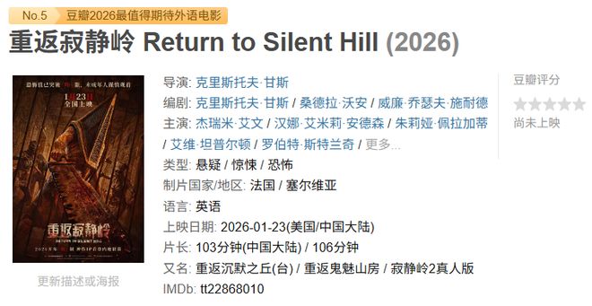 這無疑是本周最熱門的影片,經典游戲改編電影《寂靜嶺》的重啟之作,最大的看點在於首部《寂靜嶺》電影的導演克裡斯多夫·甘斯時隔近20年再度執導,所以,還是可以稍微期待下的。