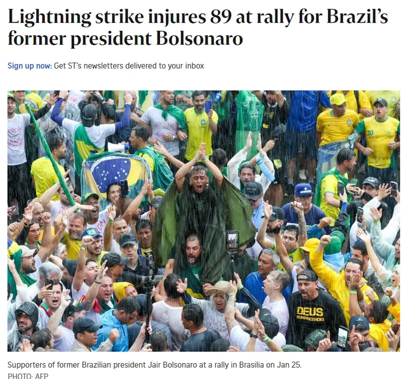 周日(1月25日),巴西首都巴西利亚一场支持前总统贾伊尔·博索纳罗(Jair Bolsonaro)的政治集会突遭雷击,造成至少89人受伤,其中多人伤势较重。