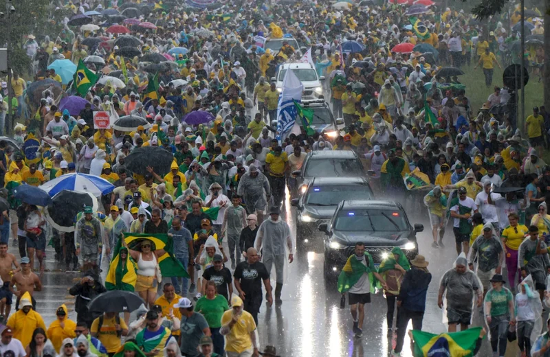 据法新社报道,当天数千名支持者冒着暴雨聚集在巴西首都,参加一场呼吁“特赦博索纳罗”的大型集会。活动由巴西国会议员尼可拉斯·费雷拉(Nikolas Ferreira)发起,现场人群撑着五颜六色的雨伞,身披雨衣,在滂沱大雨中高呼口号。