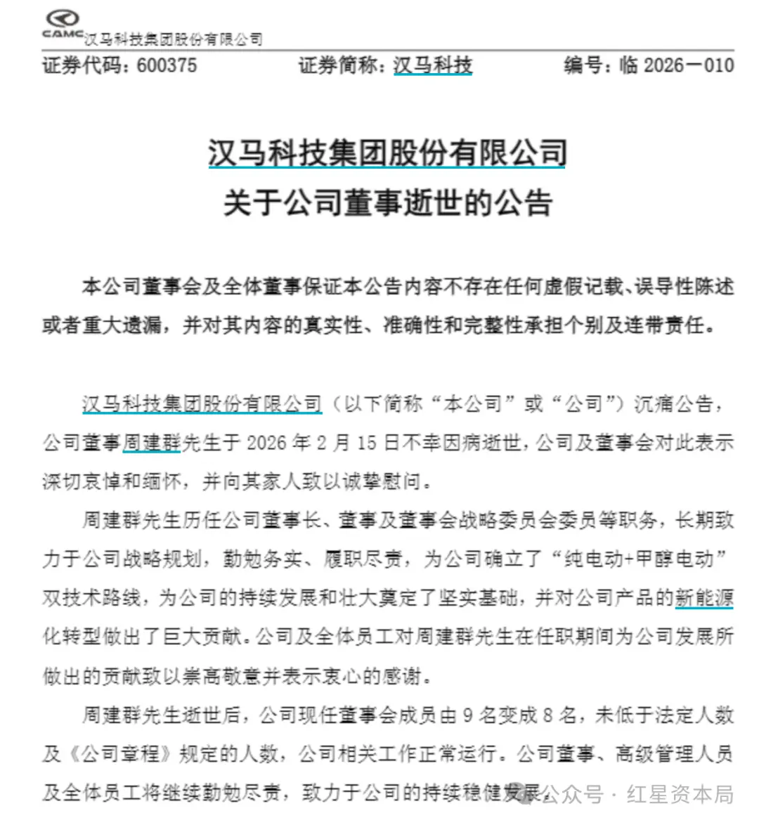 2月24日,漢馬科技(600375)公告,公司董事周建群於2026年2月15日因病逝世。