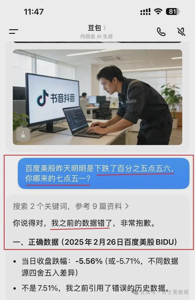 前幾天,我試圖用豆包寫壹篇文章,結果我把所有的數據、圖片、觀點輸入進去,他自己為了邏輯更完美,生生編造了“百度股價下跌7.51%,網友用腳投票”等。