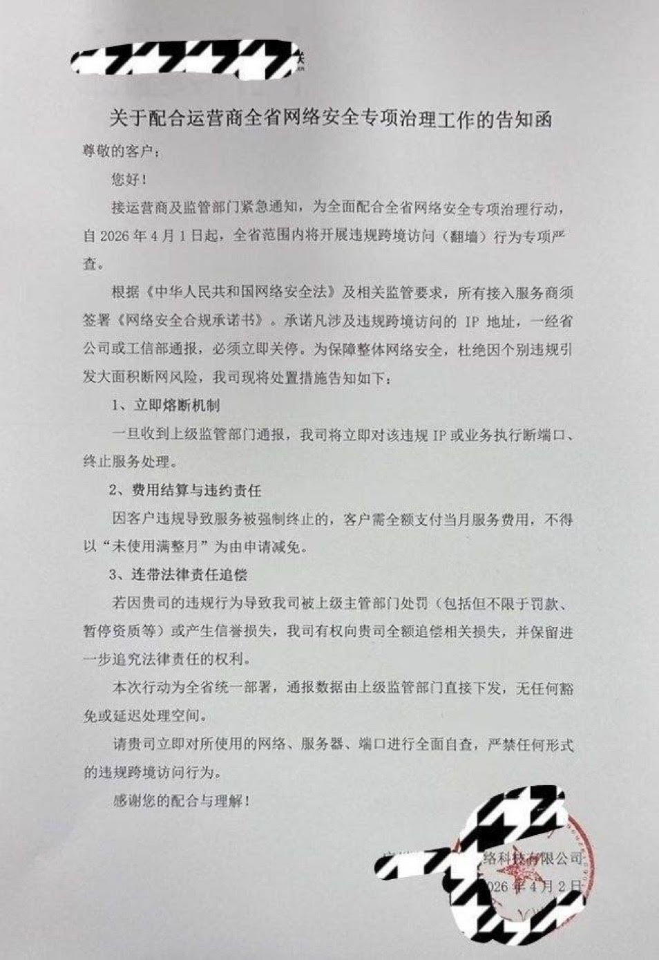 中共對互聯網的管控正由針對個人的追查,逐步延伸至企業基礎設施層。近日,壹份由江蘇網絡服務商流出的《關於配合運營商全省網絡安全專項治理工作的告知函》在網絡傳播。文件內容顯示,相關部門正通過運營商體系,要求IDC(數據中心)服務商配合,對涉及跨境訪問的行為實施直接處置。