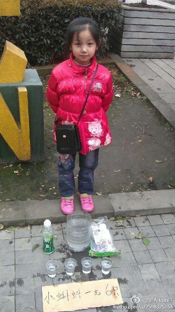 00後都有女老板啦!近日,重慶沙坪壩石碾盤某小區門口壹位賣蝌蚪的小女孩萌翻不少網友。這位小女孩身穿粉色棉襖,背著小包在叫賣蝌蚪,她說蝌蚪都是她自己抓的,不講價,壹元(人民幣,1美元約合6.2元人民幣)6只!小女孩還說,她今年7歲半,爸媽在肆川打工,她平時都和外婆住在壹起。網友說,小女孩每個周伍、周六下午都會在小區門口擺攤,有時賣金魚,有時賣蝌蚪,還有時會賣點青菜。不少網友被小女孩的乖巧和勇氣打動,還有人開玩笑說“重慶天氣再冷,也抵擋不了00後當老板的心。”