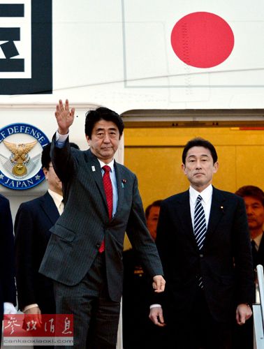 資料圖:安倍晉叁(左)在外相岸田文雄(右)等人陪同下乘機前往美國。