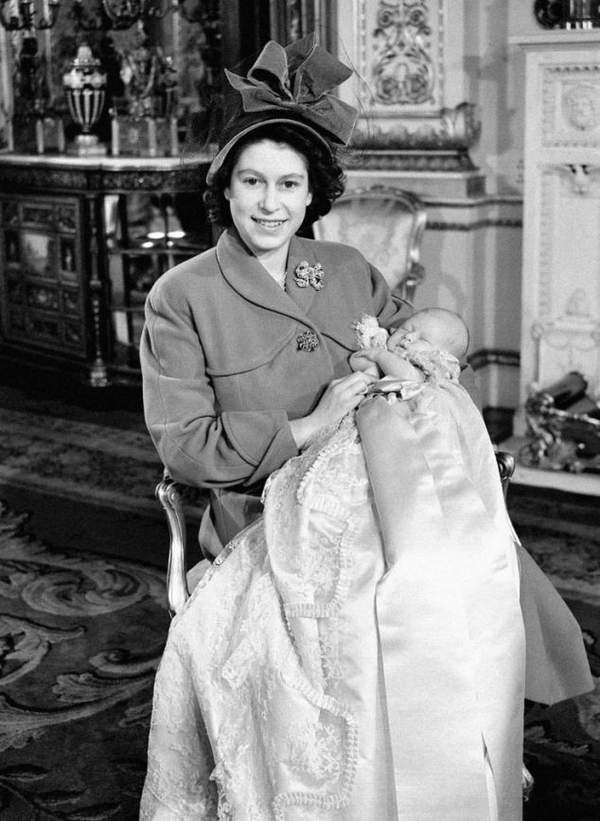 1948年12月,伊麗莎白公主抱著年幼的兒子查爾斯王子,小王子剛在白金漢宮接受了基督教洗禮儀式