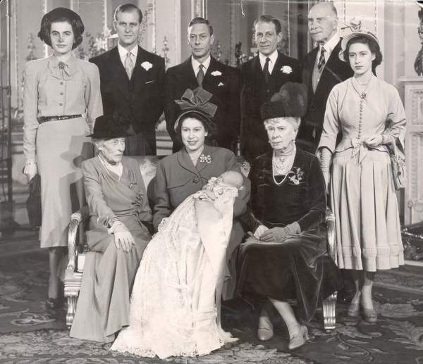 查爾斯王子的洗禮儀式:前排(從左至右)依次是米爾福德港侯爵夫人、抱著查爾斯王子的伊麗莎白公主(現在的伊麗莎白女王)和瑪麗女王(查爾斯王子的曾祖母)。
