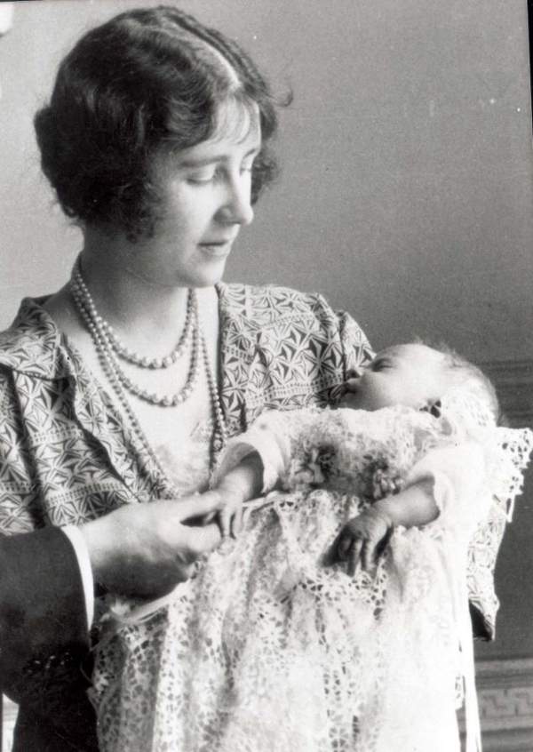 1926年,伊麗莎白女王(當今伊麗莎白女王的母親)抱著還是嬰兒的伊麗莎白公主接受洗禮。