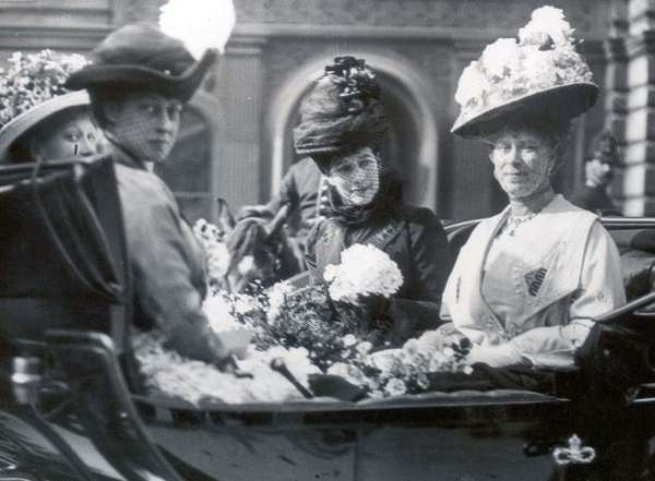 1913年,亞歷山德拉王後(最右邊),瑪麗女王(後排右)、維多利亞公主和瑪麗公主乘馬車在倫敦肆處游覽。