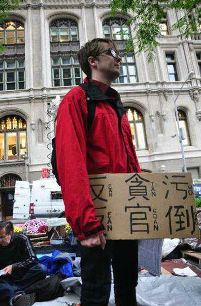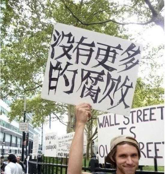 美國的“占領華爾街”運動常現雷人的中文標語
