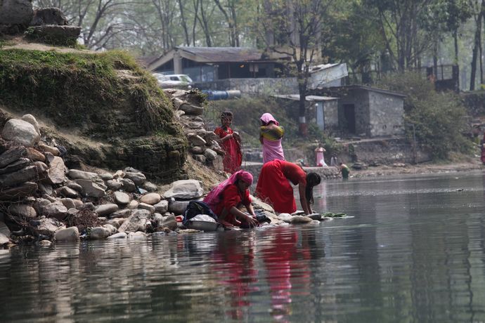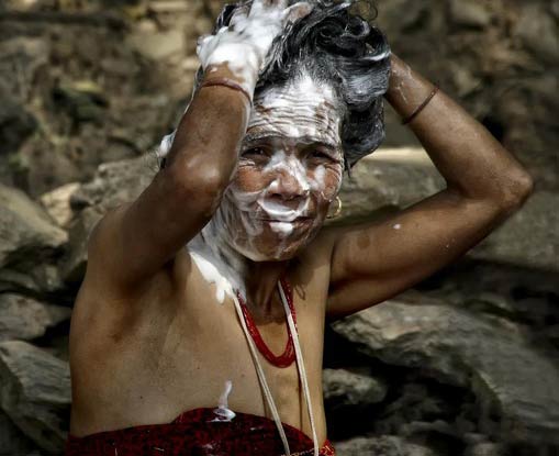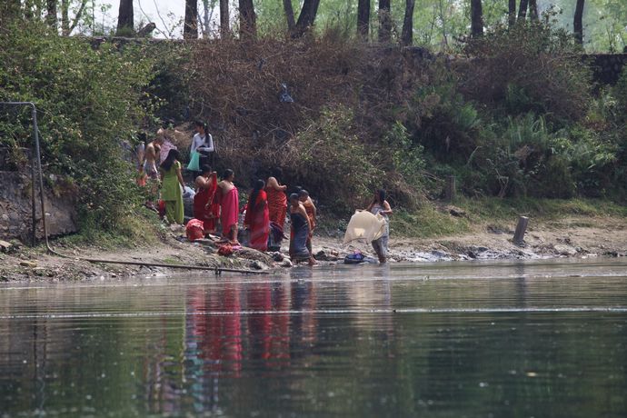 尼泊爾美女所穿的紗麗方便露天洗浴。