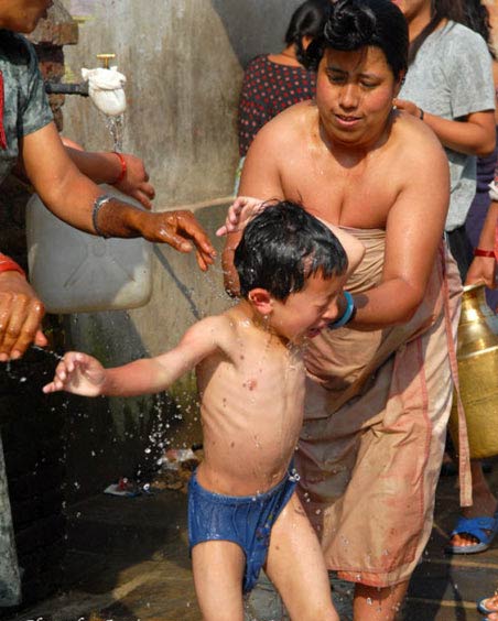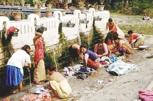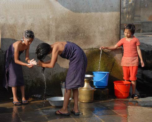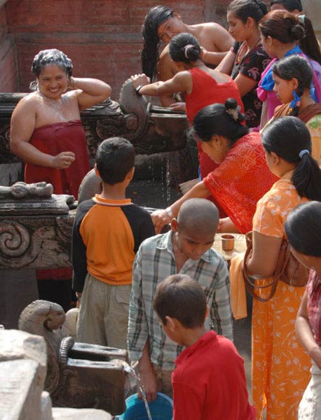 在加德滿都大街上、寺廟旁甚至居民區裡,都有很多古色古香的露天水池、噴泉和取水處。經常可以看到男男女女聚集到街邊的露天水池洗澡。雖然是在壹個水池裡,但是男女分別使用不同的水龍頭洗澡,互相之間保持著壹定距離。