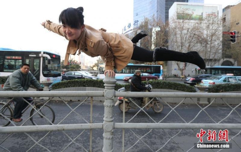 1月26日,南京山西路上,“95後”美女雪兒站上壹米多高的馬路隔離欄,單手支撐做起高難度動作,引得路人側目。據了解,雪兒來自遼寧鞍山,希望通過這種行為藝術的表演,在春節即將到來之際,呼吁市民抵制亂穿馬路、做文明交通人。她表示,以後每到壹個城市她都將進行這樣的表演,以個人的微薄之力倡導文明出行。中新社發 泱波 攝