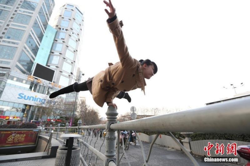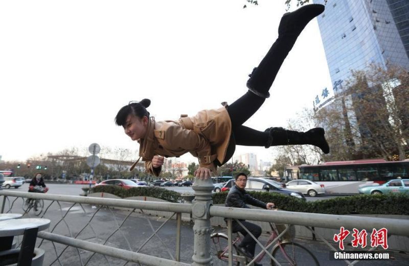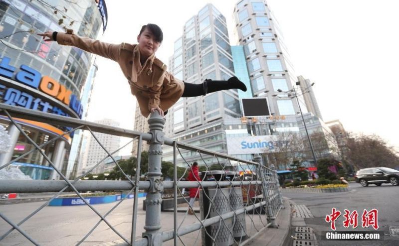 1月26日,南京山西路上,“95後”美女雪兒站上壹米多高的馬路隔離欄,單手支撐做起高難度動作,引得路人側目。中新社發 泱波 攝
