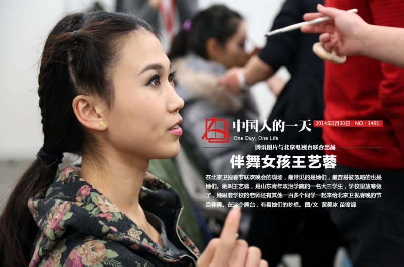 在北京衛視春節聯歡晚會的現場,最常見的是她們,最容易被忽略的也是她們。她叫王藝蓉,是山東青年政治學院的壹名大叁學生,學校裡放寒假了,她跟著學校的老師還有其他壹百多個同學壹起來給北京衛視春晚的節目伴舞。在這個舞台,有著她們的夢想。圖/文 黃吳冰 苗錦錦