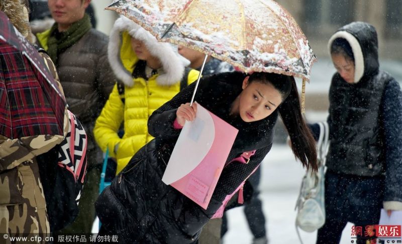 2月11日報道 7日,在2014年的初雪中,中央戲劇學院率先拉開了藝考大幕。熱門的表演系話劇影視表演專業,報錄比為1:137。而廣播電視節目主持專業因為是隔年招生,今年報錄比達到1:159,成為中戲最熱門的報考專業。上午9時,熱門景點南鑼鼓巷內並沒有多少游人。但靠近南鑼中段的中戲門前,卻圍聚了大批“俊男靚女”,他們都是來趕考的藝考生。由於學校面積有限,中戲分批組織考生入場。其余考生和送考的家長,冒雪站在校門口,相互交流著備考的技巧。上午降下的初雪,壹直沒有停的趨勢,中戲門口的候考考生,帽子、頭發上都落了壹層薄薄的雪花。