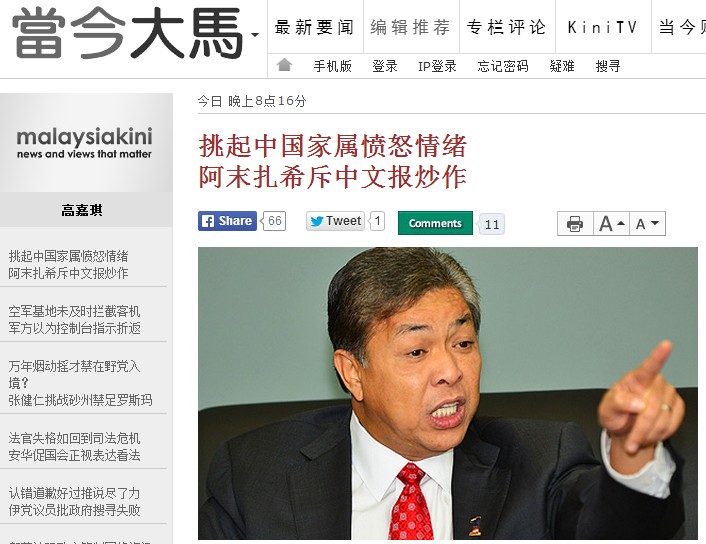 马航MH370飞机空难引起部分中国人怪罪马来西亚,甚至到大马驻中国大使馆示威。内政部长阿末扎希归咎中文报章玩弄情绪,点燃中国家属的怒火。