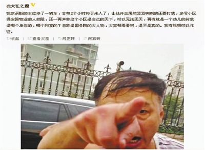 爭執期間,這名照片中的占位車主自稱是國務院的大人物,壹再聲稱小區是自己的天下,“我有視頻可以作證。”為此,不少市民要求“大江之源”公布當時錄制的視頻,還原事情的真相。