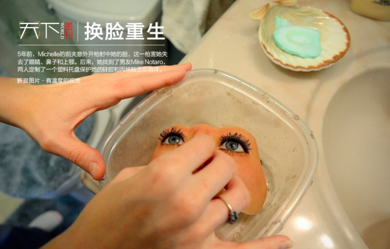 當地時間2014年4月15日,美國,Michelle Fox的男友Mike Notaro定制了壹個塑料托盤保護她的硅膠和丙烯酸面部假體。伍年前,Michelle的前夫在壹場意外中開槍射中了她的臉。攝影:Michelle Gabel/東方IC