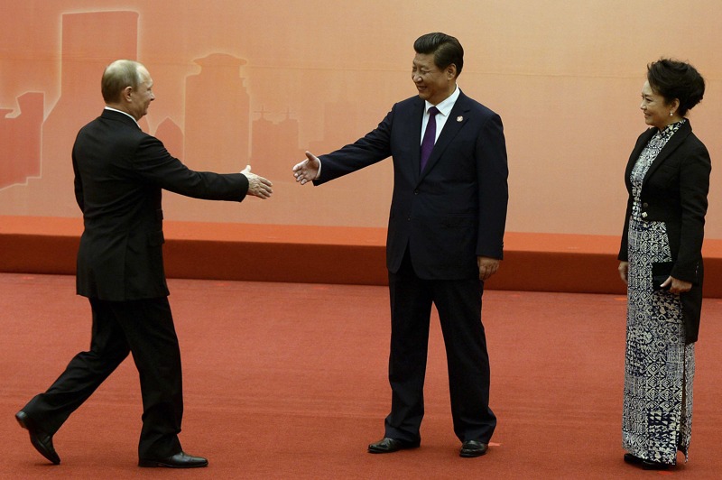 習近平與普京微笑交談。