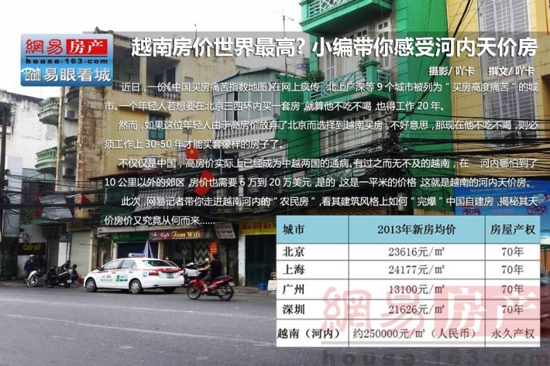 壹個年輕人若想要在北京叁肆環內買壹套房,就算他不吃不喝,也得工作20年。然而,如果這位年輕人由於高房價放棄了北京而選擇到越南買房,不好意思,那現在他不吃不喝,則必須工作上30-50年才能買套像樣的房子了。不僅僅是中國,高房價實際上已經成為中越兩國的通病。有過之而無不及的越南,在河內哪怕到了10公裡以外的郊區,房價也需要6萬到20萬美元。