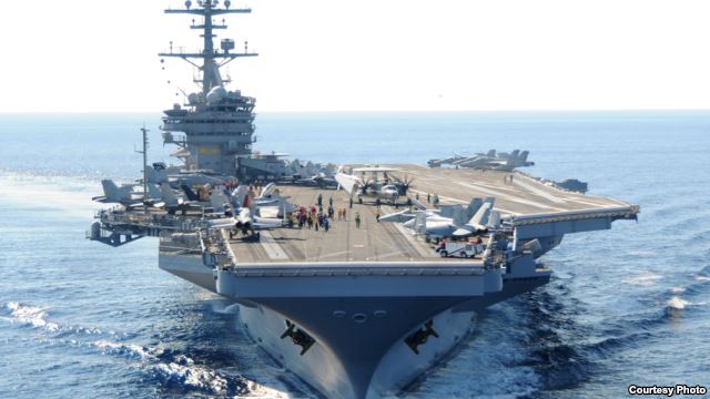 伍角大樓發言人柯比海軍少將說,國防部長哈格爾命令美國喬治•布什號航母星期六從北阿拉伯海駛入波斯灣。