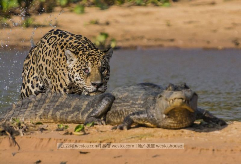 巴西潘塔納爾濕地庫亞巴河邊,壹只美洲豹從水中突然浮現,以閃電般的速度成功獵殺壹只正在沙灘上曬太陽的鱷魚。美國攝影師賈斯汀・布萊克及時捕捉到了這驚險萬分的震撼場景。
