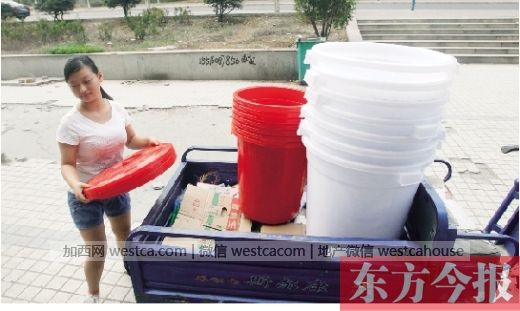 壹家超市的工作人員在搬運塑料大桶。由於平頂山嚴重缺水導致市民大量購買塑料桶以儲備水