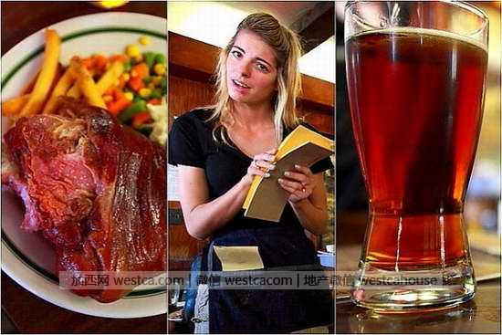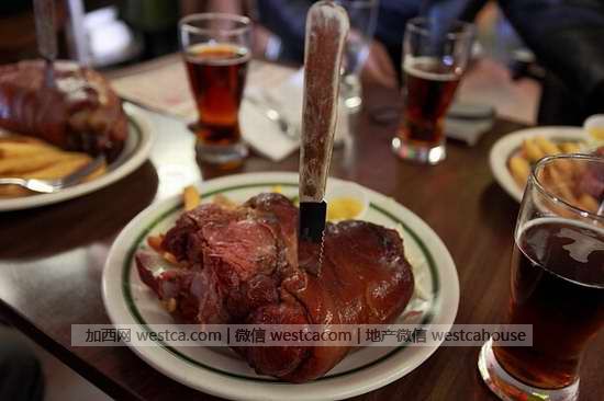 看完加拿大小鎮的巴伐利亞啤酒節大游行,當然要吃德國豬肘子。同學們知道有壹個在多倫多華人圈子裡有名的德國豬肘子店,壹路走國王大街,來到小鎮,壹拐彎把車停靠,來得早,還有空位,壹人要了壹個豬肘子。小劉同學想給兒子打包壹個豬肘子,被漂亮的女侍者拒絕,今天人多肘子少,每人限量壹只。