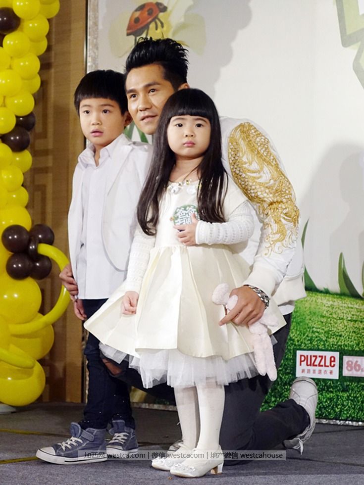 歌手曹格(中)15日帶兒子Joe(左)及女兒Grace(右)宣傳節目《爸爸去哪兒》