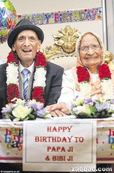 這兩位年齡加起來達211歲的老人,於1925年在印度喜結連理,1965年移居英國至今。目前,他們和8個子女、28個孫輩及23個曾孫壹起生活在英國布拉德福德郡。