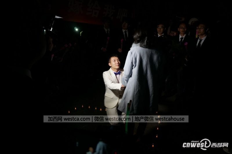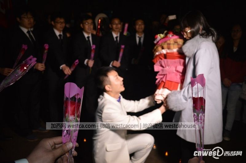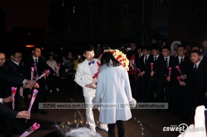 3 月25日晚上十点多,西北工业大学航天学院女生宿舍楼下,一群男生西装革履,口号整齐,朝着楼上大声喊叫,引来不少男生女生围观。据了解,这是西工大航天学院2012级硕士研究生杨乐的同学,为他精心策划的一场求婚。女主角折思鸿是西工大航天学院2013级硕士研究生,两人相恋十年。今年4月,杨乐研究生毕业,将赴中航国际航空公司(北京)参加工作。为了能在毕业前让法律为爱护航,杨乐出其不意带着兄弟们“夜袭”女生宿舍楼,浪漫求婚。