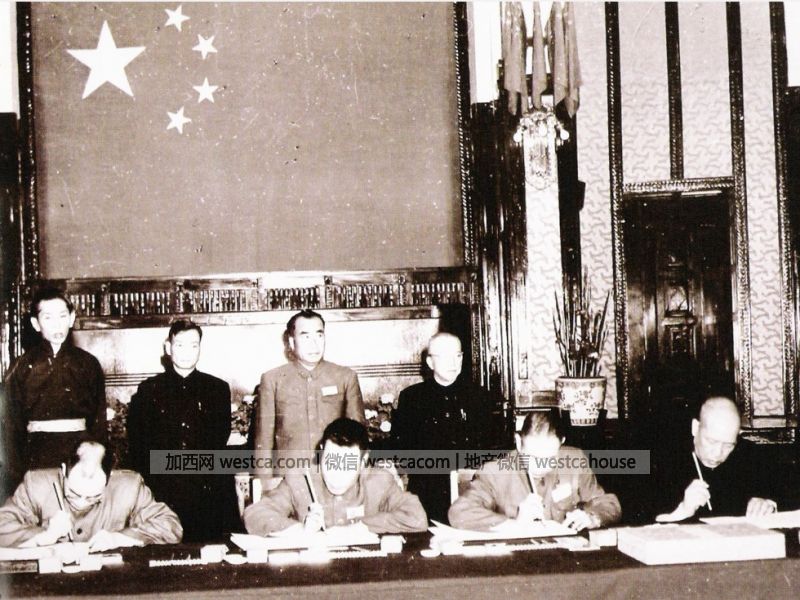 1951年5月23日,中央人民政府与西藏地方政府(噶厦)代表与在北京中南海勤政殿签署《关于和平解放西藏办法的协议》(简称十七条协议),图为中央人民政府代表签字,后排起:西藏地方政府首席代表阿沛·阿旺晋美、中央人民政府政务院副总理陈云、中央人民政府副主席朱德、李济深