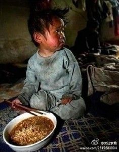 记者在中国一贫困山区采访时拍摄的一张照片----记者对孩子的母亲说:尽量让孩子少吃这些油炸的速食垃圾食品。孩子的母亲说“没关系,不经常吃。但是每年都会给孩子煮一次,因为今天是孩子的生日,其实我们根本舍不得吃……”