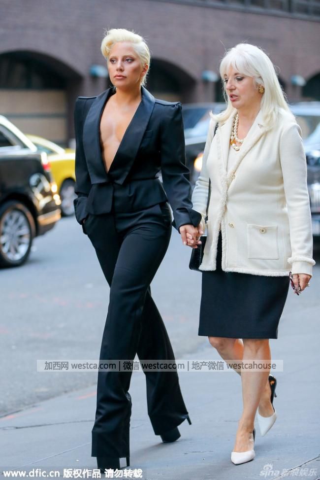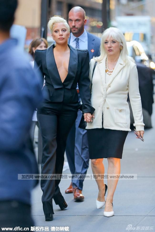 当地时间2015年6月24日, 美国纽约,Lady Gaga与妈妈出街,真空上阵穿西装,踩超高跟鞋挽妈妈手臂“黑白双煞”。