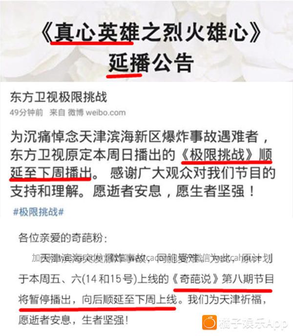 又到周末,不過因為之前天津塘沽的爆炸事件,江蘇衛視的的《真心英雄》、東方衛視的《極限挑戰》,愛奇藝的《奇葩說》都會停播壹周!