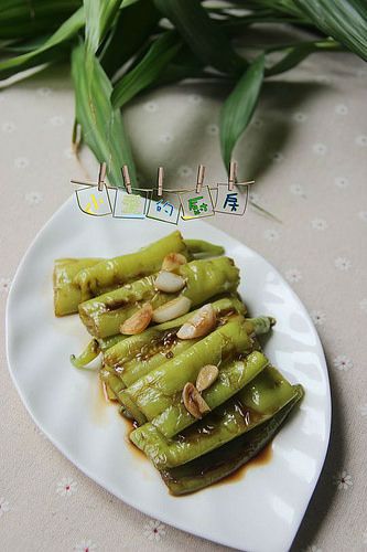 尖椒 300克,大蒜 5克,醬油 1茶匙,香醋 1湯匙,