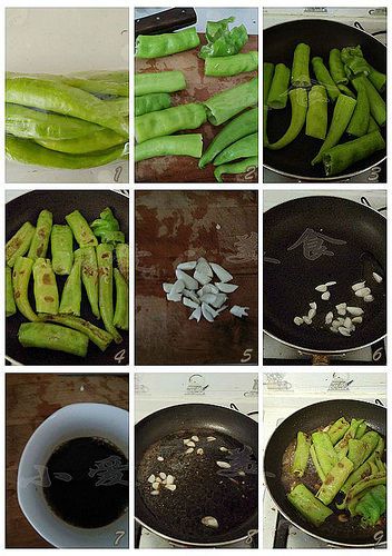 主要食材是尖椒,先將尖椒在鍋中煎出褶皺,