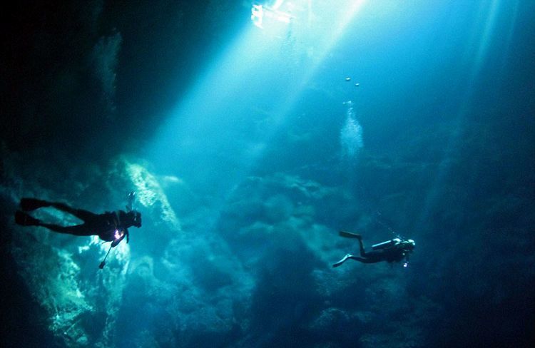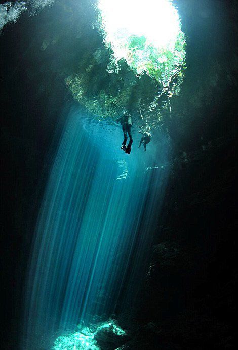 古玛雅人的深坑位于墨西哥金塔纳罗奥州的丛林深处,为石灰岩构成的天然井,水深400英尺(约122米)。照片中,特洛伊和安东尼奥身戴潜水器潜到10米多深的地方。在光照下,水底呈现出一片深蓝色,显得异常诡异。