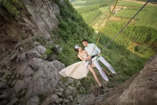 在新人的提議下,毫無攀岩經驗的攝影師OY也同這對勇敢的戀人壹起,勇敢的掉在幾拾米高的懸崖上拍了3個小時,當拍攝完成,OY在雙腳落地的時候,由於大腿被勒得血液不通,兩條腿竟然毫無知覺,坐在地上恢復了10幾分鍾才能正常行走。