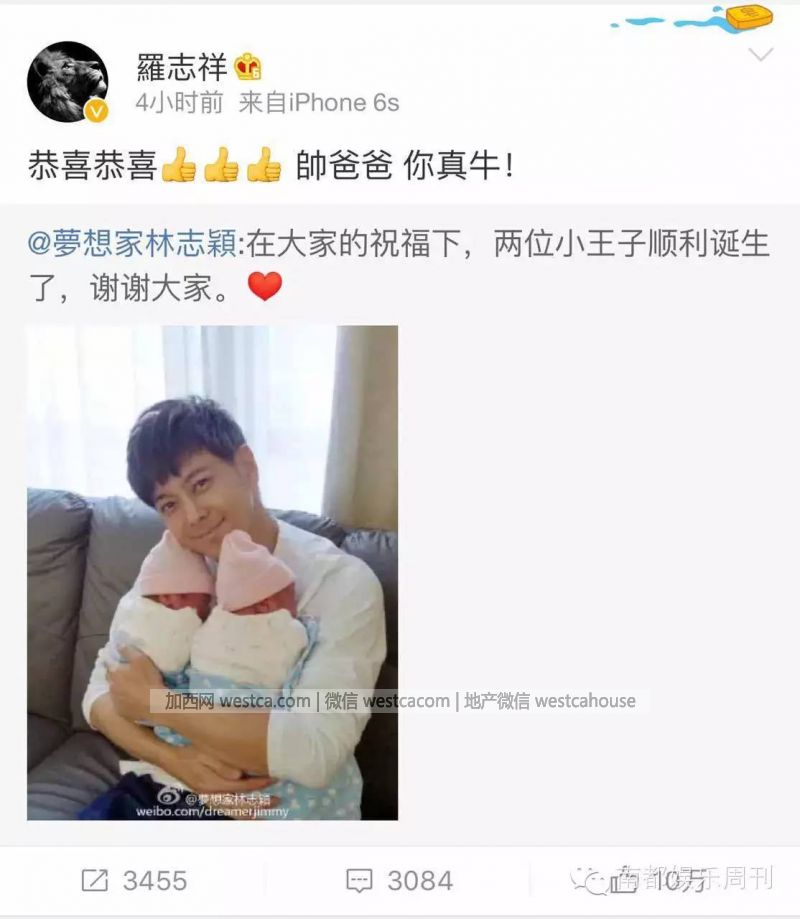 不老男神林志穎的雙胞胎兒子今天出生啦,Kimi正式升級當哥哥!12月5日下午,林志穎在微博曬出懷抱雙胞胎小王子的照片,難掩喜悅之情,他在微博寫道:“在大家的祝福下,兩位小王子順利誕生了,謝謝大家。”隨後,王岳倫、羅志祥等也轉發微博送上祝福。