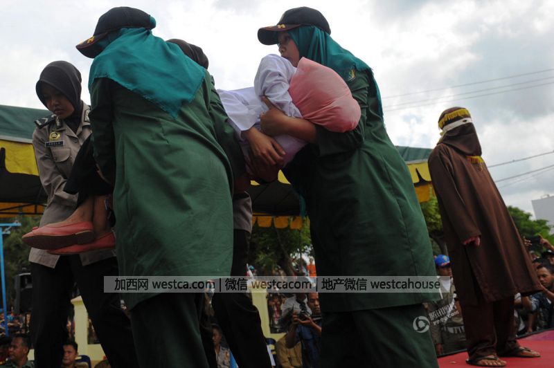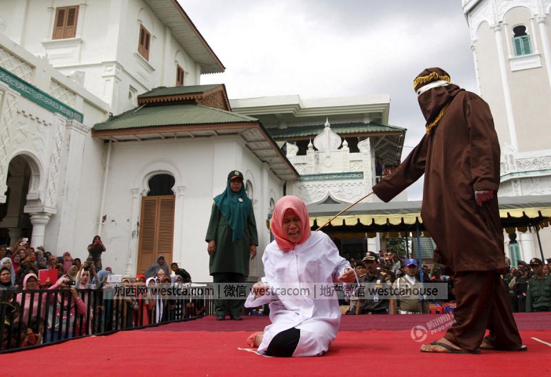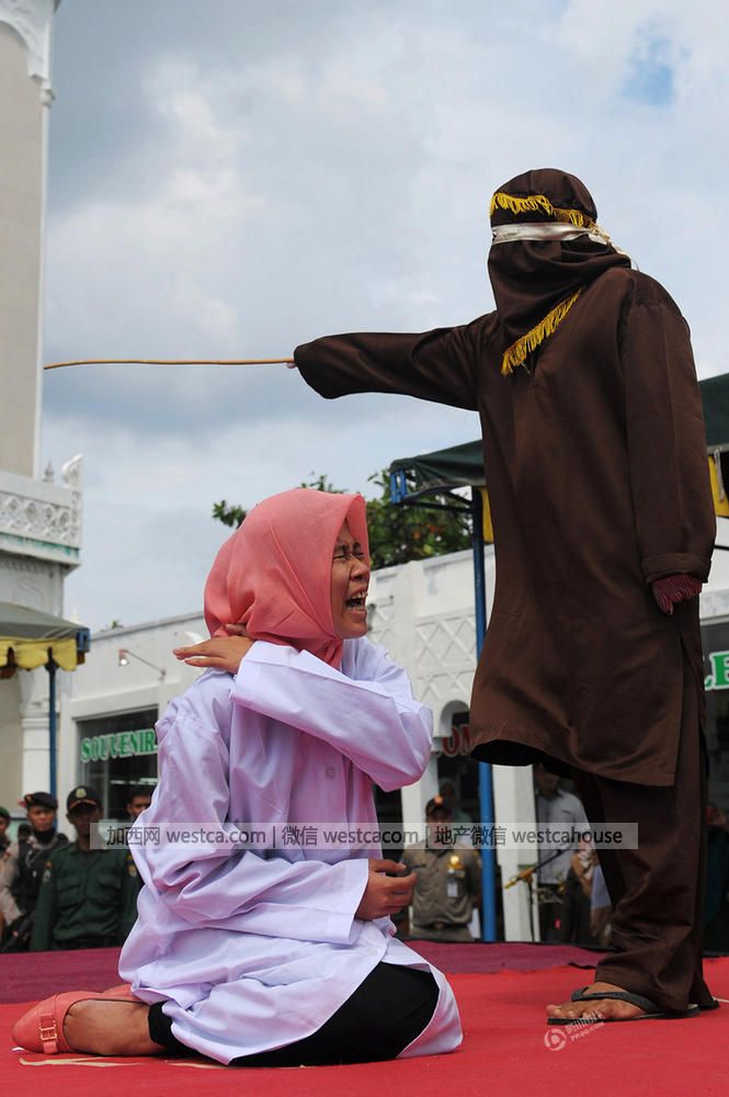 當地時間2015年12月28日,印尼班達亞齊Baiturrahman清真寺,20歲的Nur Elita因與她的男朋友有婚前性行為,違反了伊斯蘭教法,在公眾面前接受鞭刑。