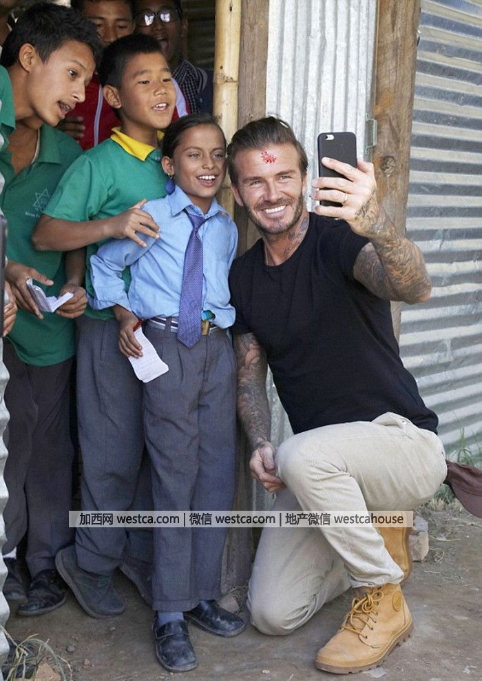 官方照片:為了即將推出的電視節目,大衛·貝克漢姆在7大洲踢了7場足球賽。圖為在尼泊爾加德滿都市什裡帕德瑪中學與學生合影。圖片來源:網絡