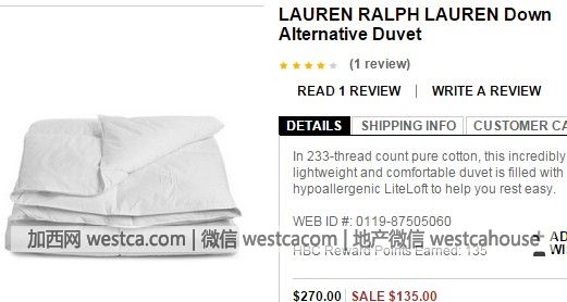1.Lauren Ralph Lauren輕薄羽絨被:特價$135,原價$270