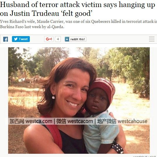 其中不幸遇難之壹,加拿大女性莫德.加裡埃Maude Carrier的丈夫伊夫.理查德Yves Richard向蒙特利爾98.5 FM廣播電台證實,當加拿大聯邦政府總理杜魯多打電話向他表示哀悼和慰問時,他沒說幾句話就掛斷了杜魯多的電話。