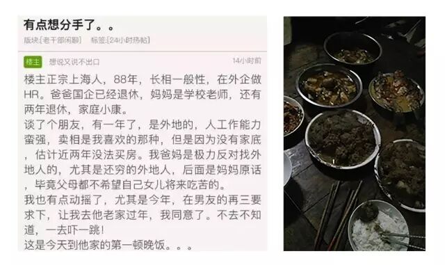 最近網上有個挺火的新聞,題目叫做《上海女孩跟男友回農村過年,見第壹頓飯後想分手》,說壹位小康家庭的上海女生,過年跟江西男友回農村,交通不方便壹路顛簸,但見到第壹頓飯她後悔了,決定和男友分手並立即回上海。(下面是這個女孩網上發的帖子和拍的照片)