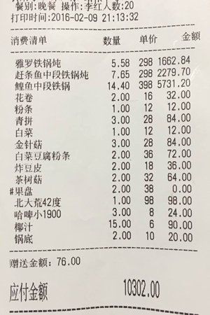 注冊資料為江蘇常州的網友“@jack光頭”2月12日微博發帖稱,其在導游帶領下在哈爾濱松北區的“北岸野生漁村”壹家餐廳就餐,知道魚的單價分別為398元/斤和298元/斤,但結賬時發現此前稱重10.4斤的鰉魚,變成了14.4斤,同時另外兩種魚也被亂寫斤兩,兩桌飯共花了10302元。“@jack光頭”提供的消費清單截圖顯示,其中“鰉魚中段”14.4斤,單價398元,合計5731.2元。