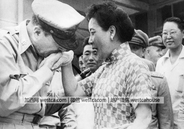 初到台灣,宋美齡對外交熱情高漲,多次往返於台灣和美國之間。圖為1950年8月7日,在參加完蔣介石的國民政府會議之後,麥克阿瑟將軍親吻戴著白手套的宋美齡。
