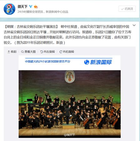 2月23日,新浪的“微天下”發微博披露,“朝中社報導,由省文化廳副廳長蘇威率領的中國吉林省交響樂團20日抵達平壤,開始對朝鮮進行訪問。”