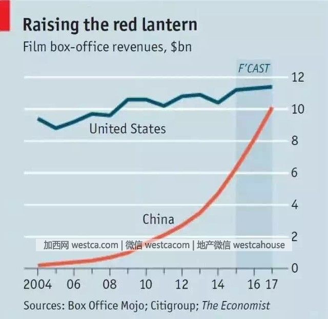 圖贰展示了中國電影票房過去幾年和美國的對比。從中我們可以看出,不久的即將來中國的電影票房就將要超越美國成為全球最大的票房國家。
