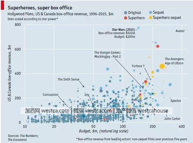北美電影市場基本上已經成熟,票房的波動主要看海外市場和年度大片。圖叁統計了過去20年北美票房回報特征:1)回報率基本上跟著成本走,越來越難看到小制作電影能夠成功(比如當年的The SixthSense)。大制作也意味著更多院線排片。成本在1000-4000萬美元的電影平均獲得1600個電影院排片;成本在1億美元以上的電影平均獲得3500個電影院排片;2)續集越來越多。在其他因素不變的情況下,續集電影平均多賺3500萬美元。原因也很簡單,續集有粉絲經濟,減少了票房的不確定性;3)超級英雄電影越來越多(我覺得是迪斯尼收購漫威後的商業化能力)。1996--2000年壹共才8部超級英雄電影,但過去伍年出了19部。壹部成本2億美元的超級英雄電影要比同樣成本但不是超級英雄題材的電影平均多賺5800萬;4)電影明星的號召力。類似於JennniferLawrence和小李子這樣票房過5億的明星加盟,會增加平均1000萬的票房;5)影評重要嗎?完全不影響。這裡說的是專業影評。比如許多爛西紅柿獎的電影都是高票房。